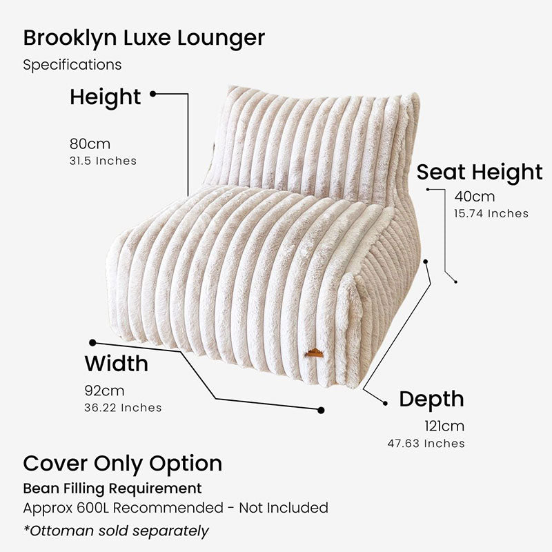 The Brooklyn Luxe Lounger is where soft form meets contemporary design. Crafted from wide rib corduroy faux fur in a warm champagne tone, this modern bean bag lounger offers relaxed comfort with an interior styling edge. Its armless silhouette and generous proportions make it ideal for laid-back living without compromising on aesthetics.